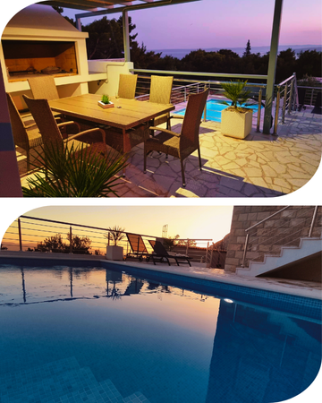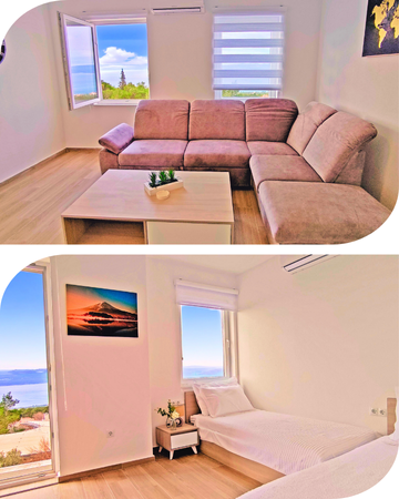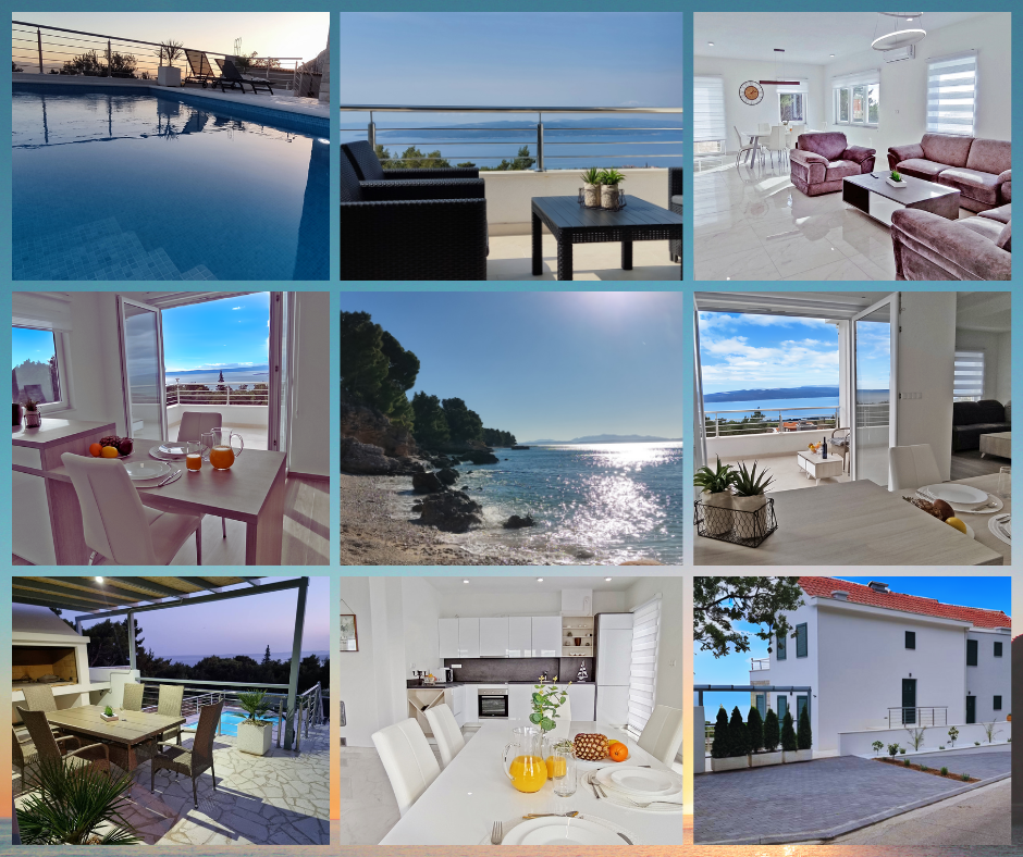 This beautiful, modern four-bedroom villa has a heated private pool, two living rooms, two fully equipped kitchens, four bathrooms, a sea view, and free parking.
